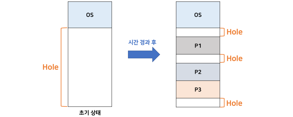 시간이 지날수록 메모리의 초기 상태와는 다르게 여러 프로세스가 적재되었다가 빠지기를 반복하면서 여러개의 작은 hole이 생길 수 있는데 이것으로 인해 메모리 낭비를 볼 수 있다. 이러한 현상을 '메모리 단편화' 라고 한다.