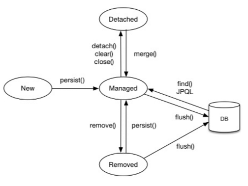 - Removed : 엔티티를 삭제한다. 엔티티와 매핑되던 데이터베이스의 데이터 또한 삭제된다.